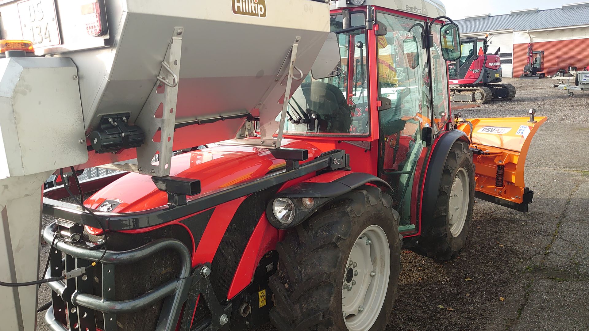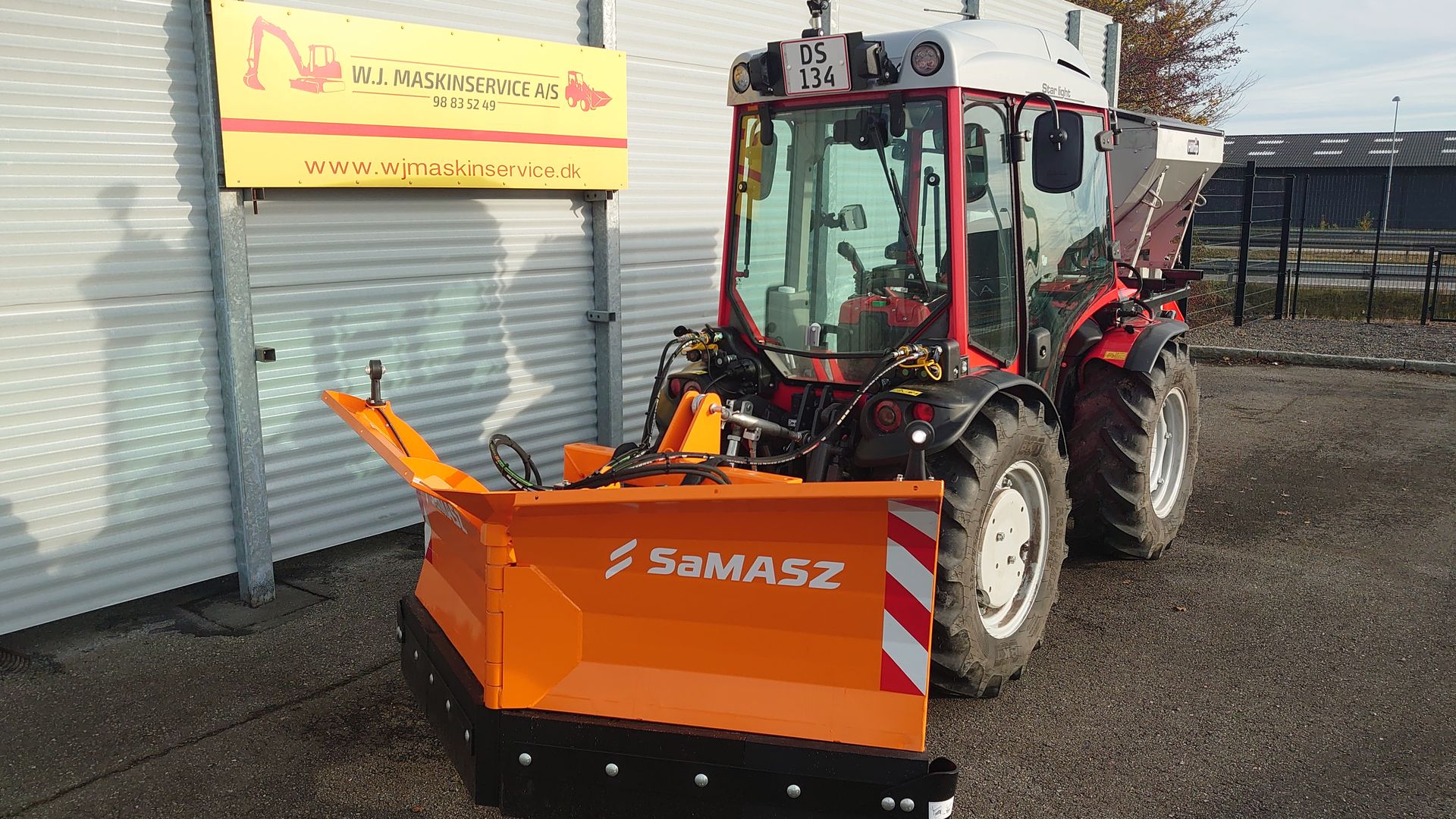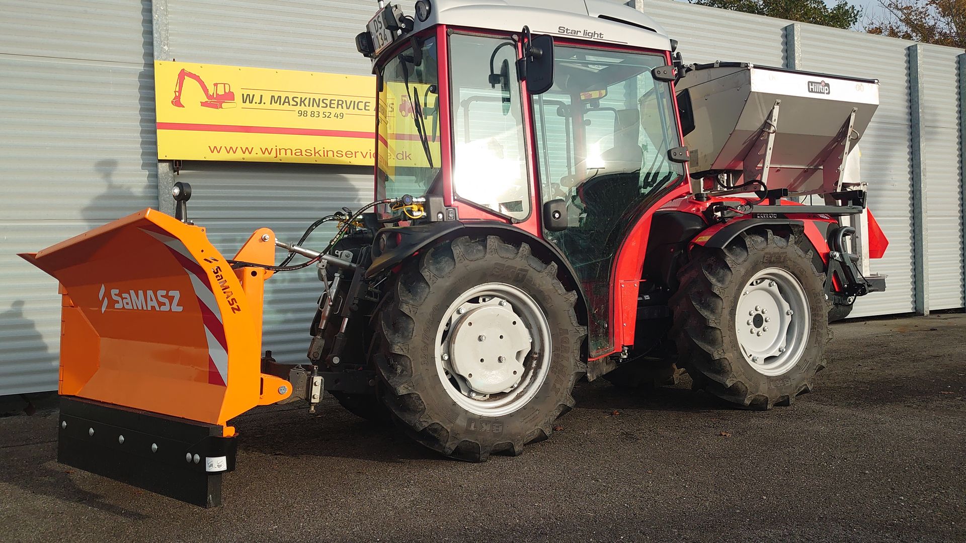 Traktoren er vist med Hilltip 380 spreder og Samasz 180cm V-plov (Kan tilkøbes)